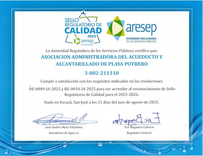 CERTIFICADO SELLO DE CALIDAD REGULATORIO ARESEP – ASADA SURFSIDE